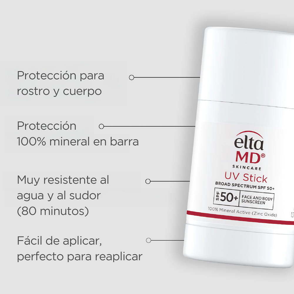 EltaMD UV Stick FPS 50+ es un protector solar 100% mineral en barra, de amplio espectro, sin color y fácil de aplicar. Su fórmula transparente ofrece protección efectiva contra los rayos UVA y UVB, además de incluir antioxidantes que protegen la piel del daño ambiental. Es ideal para reaplicaciones rápidas y precisas en zonas sensibles o de difícil acceso como el contorno de ojos, labios, nariz y orejas. Incluye además cera de abeja, manteca de cacao, escualeno y otros emolientes que mejoran la textura y adherencia sin obstruir los poros ni causar irritación.