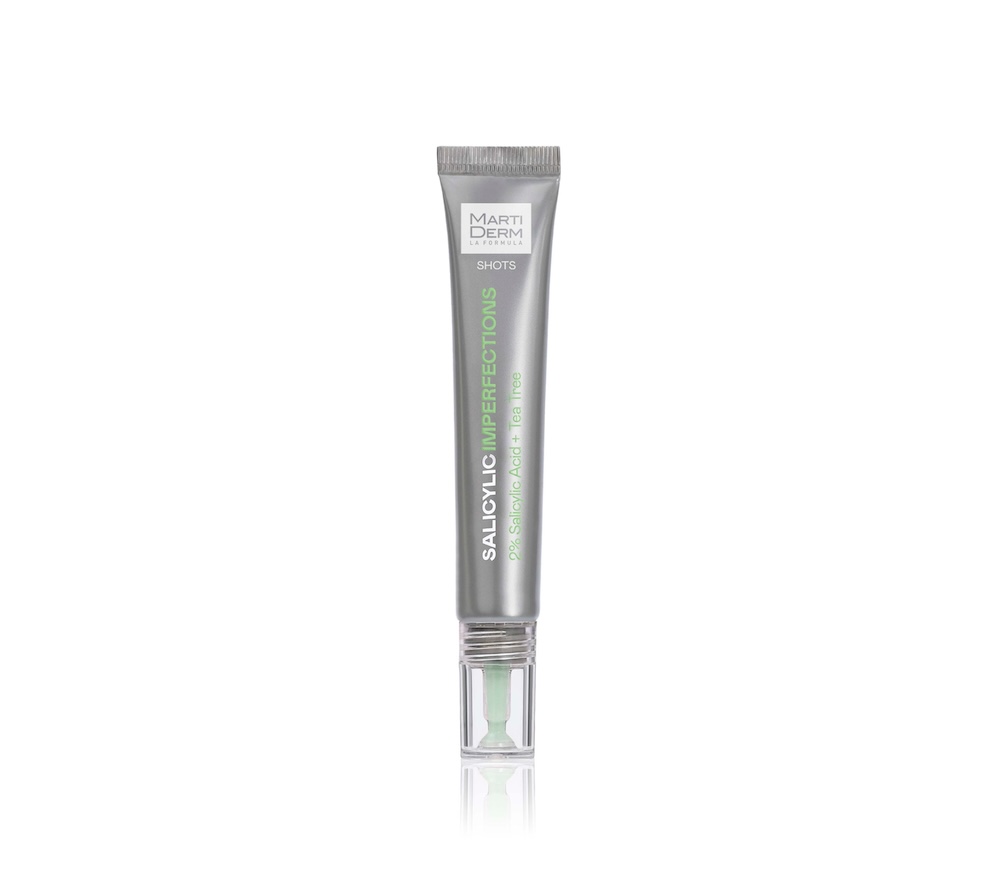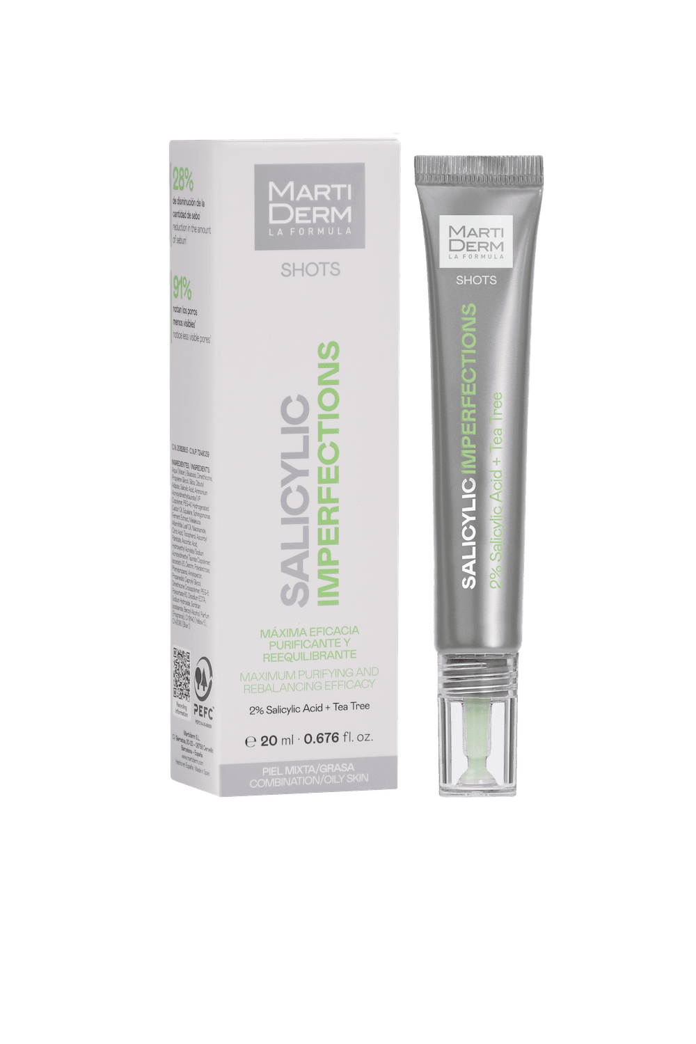 El Shot Salicylic Imperfections de Martiderm es un cremigel formulado especialmente para pieles mixtas, grasas o con tendencia acneica. Su fórmula combina un 2% de ácido salicílico, un potente activo queratolítico y seborregulador, con extracto de árbol de té, reconocido por su acción antibacteriana y calmante. Esta sinergia ayuda a purificar la piel, controlar el exceso de sebo, reducir el tamaño de los poros y acelerar la desaparición de imperfecciones, todo sin resecar ni dejar sensación grasa.