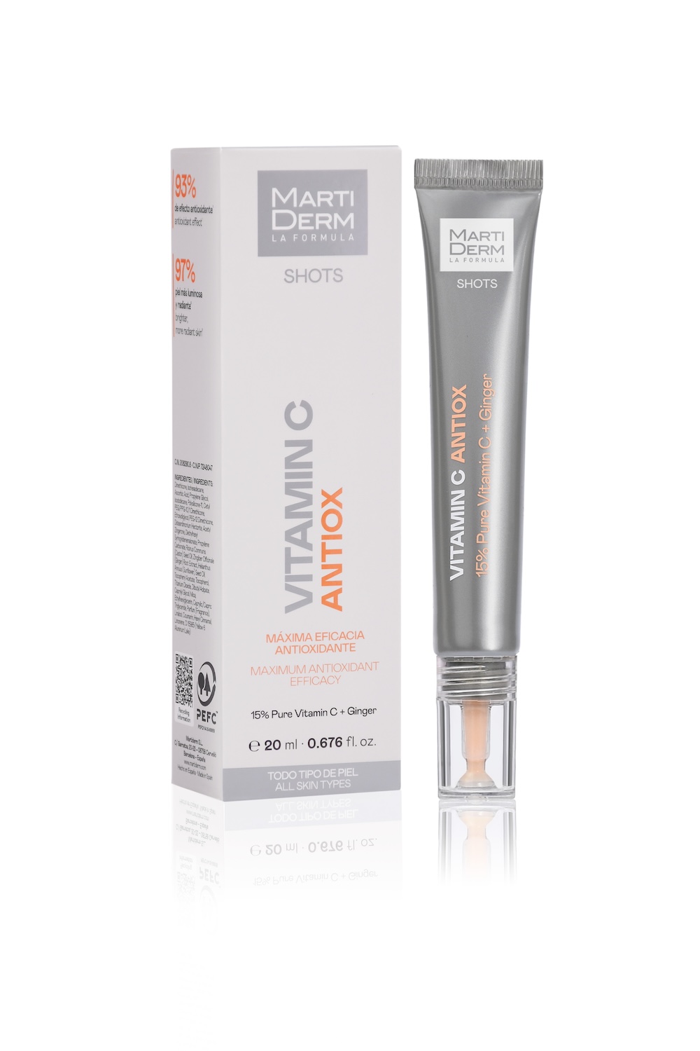 El Shot Antiox Vitamina C de Martiderm es un sérum antioxidante en bálsamo, no graso y de rápida absorción, formulado con un 15% de vitamina C pura y extracto de jengibre. Esta combinación potencia la acción antioxidante, ayudando a neutralizar los radicales libres, prevenir el envejecimiento prematuro y aportar luminosidad y uniformidad al tono de la piel.